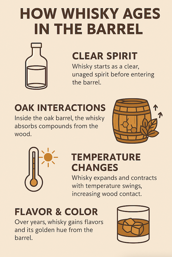 Whisky starts as a clear spirit, and it only gets its flavors and trademark golden color from years spent sitting in oak barrels. The barrel aging process is where the real magic happens; this is where whisky develops its character, smoothness, and all those delicious notes of vanilla, spice, caramel, or smoke depending on the cask type. During barrel aging, the whisky interacts with the wood, takes in compounds from the oak, and even reacts to slight temperature changes in the warehouse. Oxygen sneaks in through the wood, mellowing the whisky over time and building up complexity.